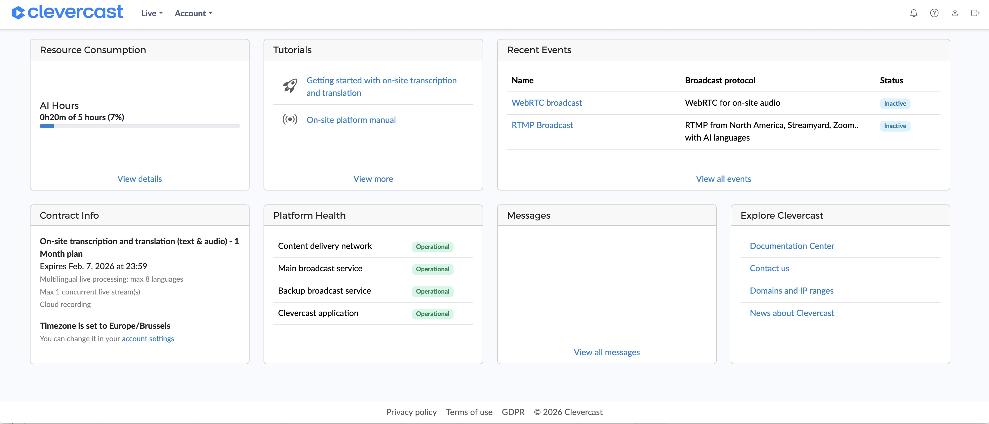 The Live menu and its Events submenu contain the main functionality of this platform. It lets you create and manage live streams of AI transcription and translation for on-site organizers and participants. Unless specified otherwise in your plan, your account allows for one simultaneous live stream. This means that you cannot broadcast to two events at the same time.